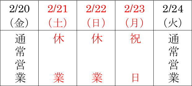 ※ 休業中のお問い合わせにつきましては、2月24日(火)以降に対応致します。